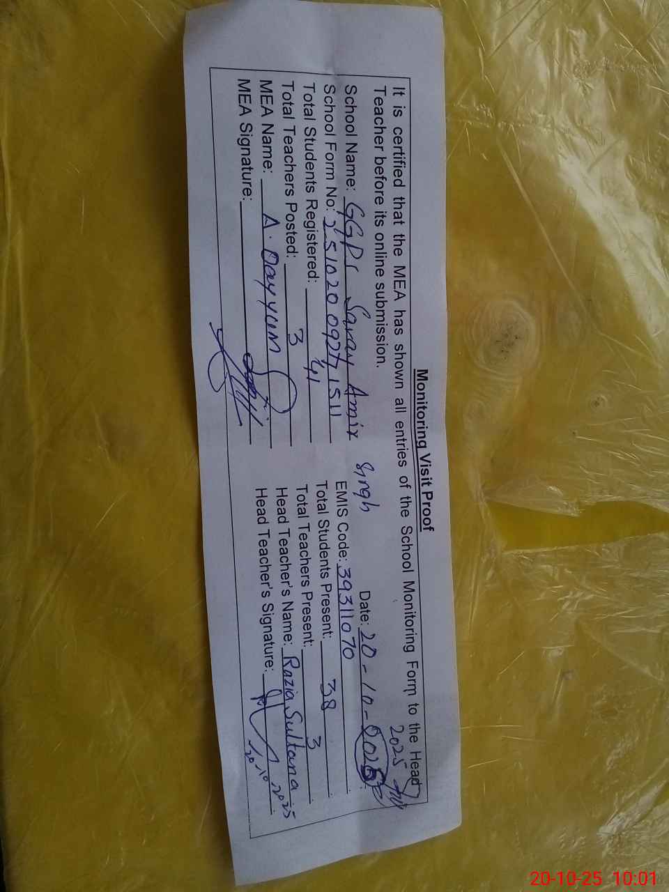 | Attendance Register | Head Teacher | MEA with School | Visit Proof |
