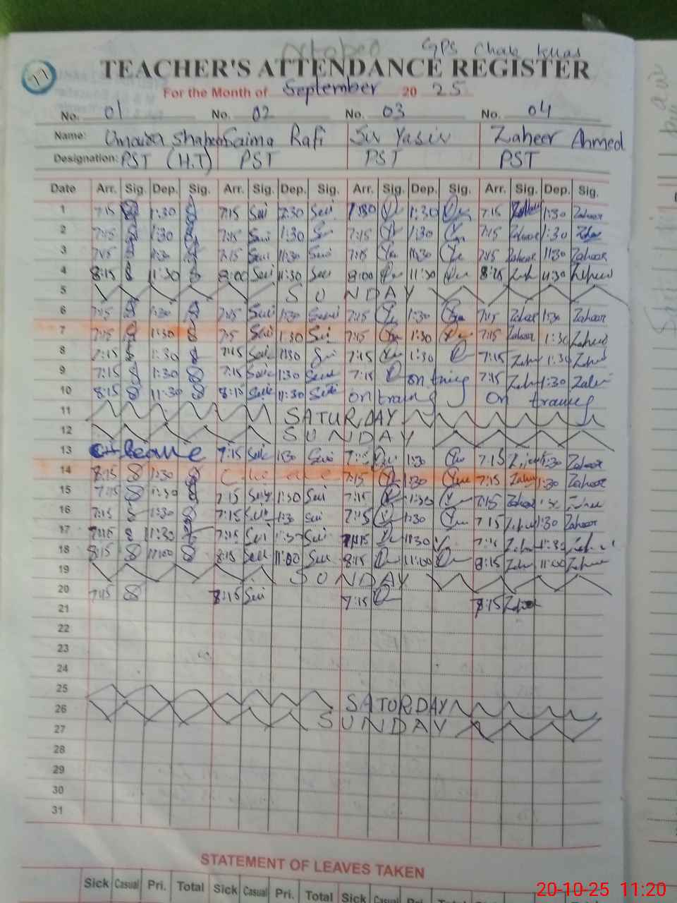 Leave Type | Remarks for today (Leave,Training, Exam,Absent,Late, Other duty) |