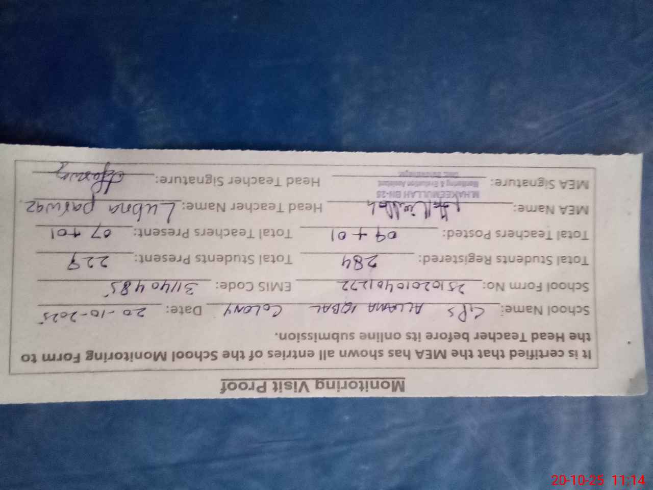 | Monitoring Date: 20-10-2025 | Start Time: 20-10-2025 10:40 AM | End Time: 20-10-2025 11:16 AM | Name of MEA: Mu**** ha**** ul**** BN25 | |