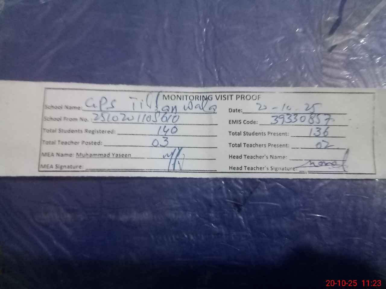 | Attendance Register | Head Teacher | MEA with School | Visit Proof |