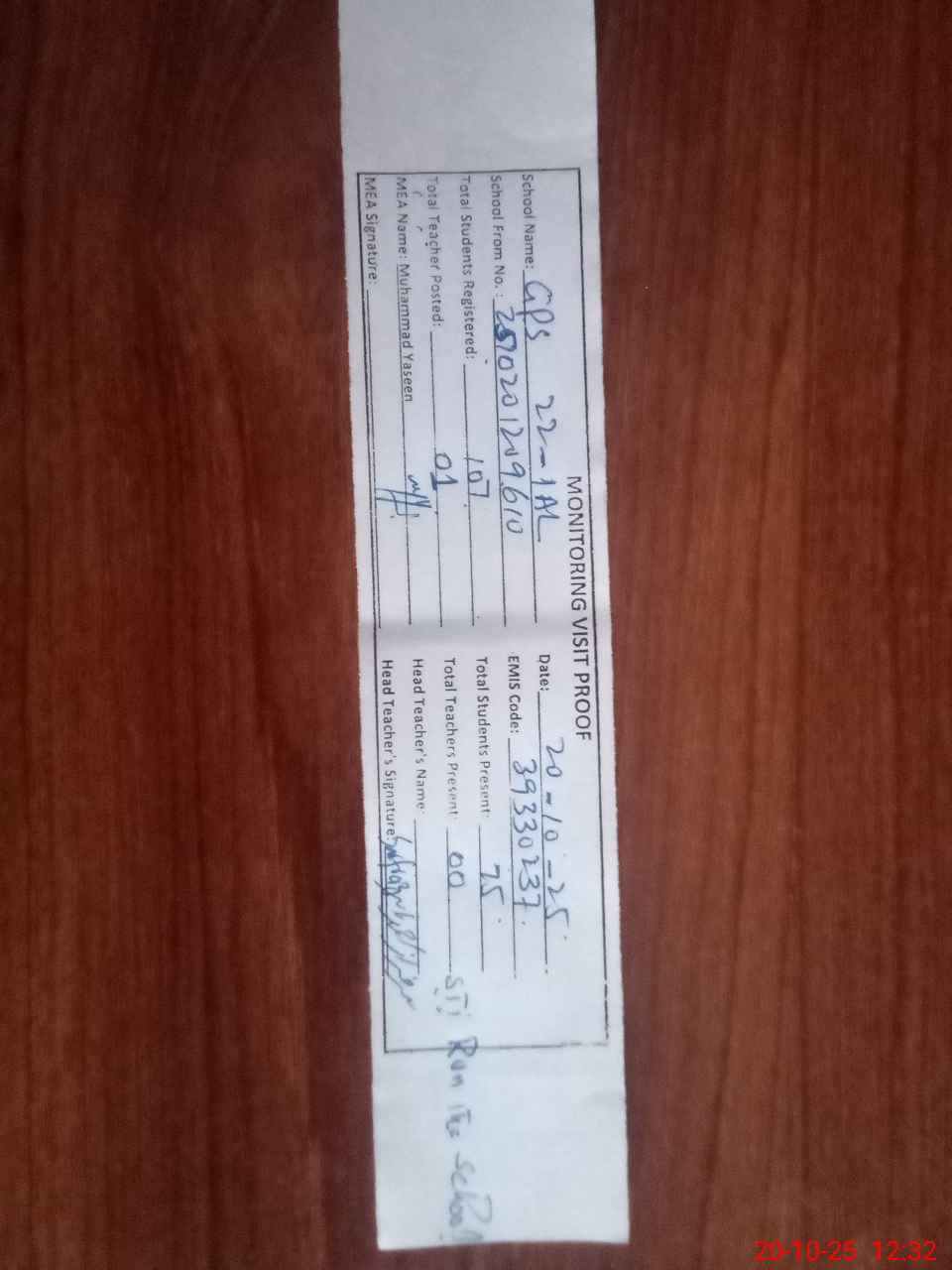 | Attendance Register | Head Teacher | MEA with School | Visit Proof |
