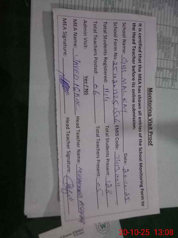 | EMIS Code: 34130011 | Name of School: GHS MALKAY | |||
