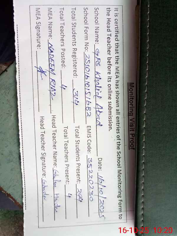 | EMIS Code: 35220230 | Name of School: GPS KHALID ABAD | |||