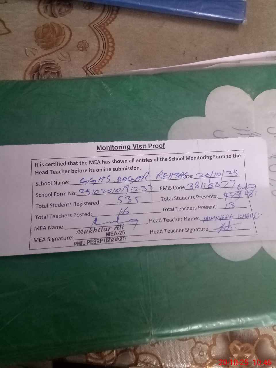 | Attendance Register | Head Teacher | MEA with School | Visit Proof |