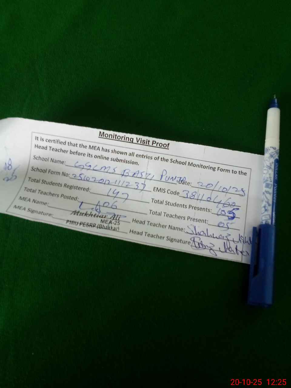 | Monitoring Date: 20-10-2025 | Start Time: 20-10-2025 11:56 AM | End Time: 20-10-2025 12:25 PM | Name of MEA: Mu**** Al**** | |