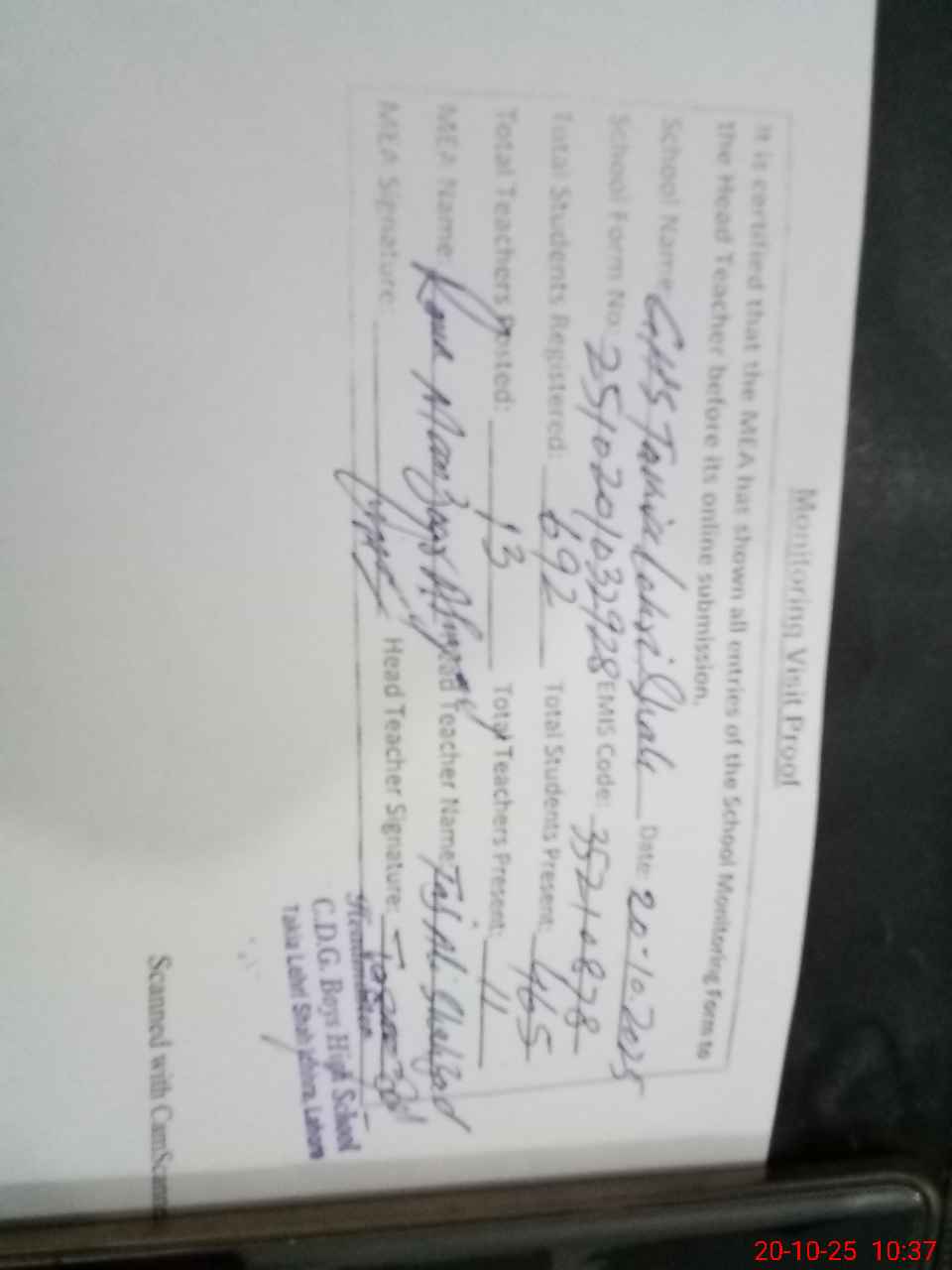 | Certified that this School was Inspected by the Undersigned MEA/DMO Today and the Information Stated Above is as Per Record. | |||||