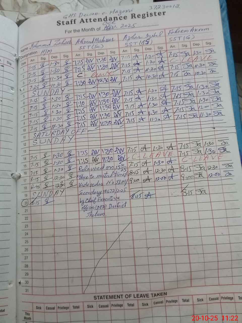 | CNIC | Full Name | Designation | R/C | Absence During Last Calender Month |