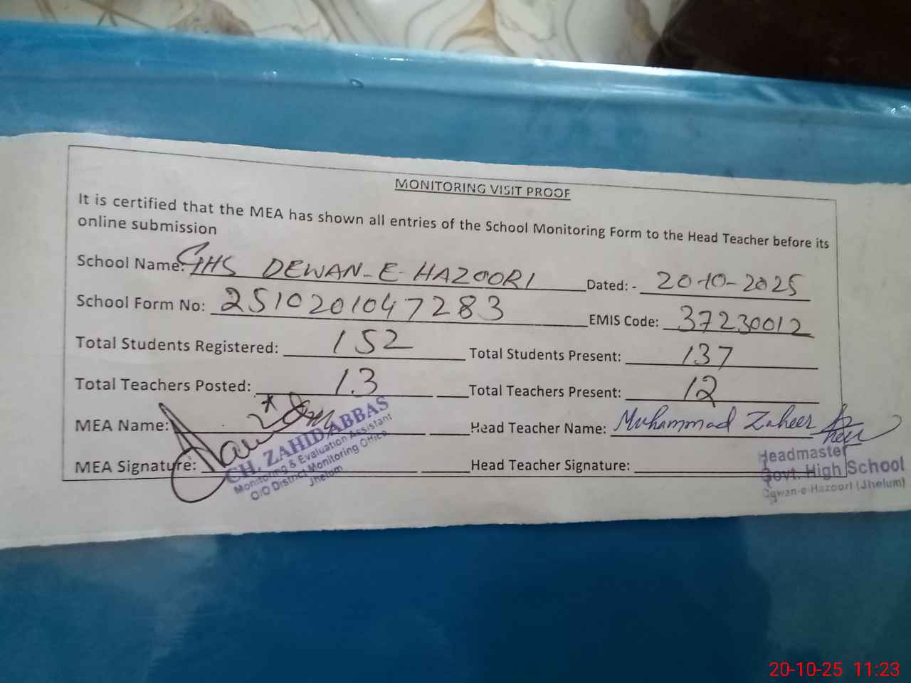 | Attendance Register | Head Teacher | MEA with School | Visit Proof |