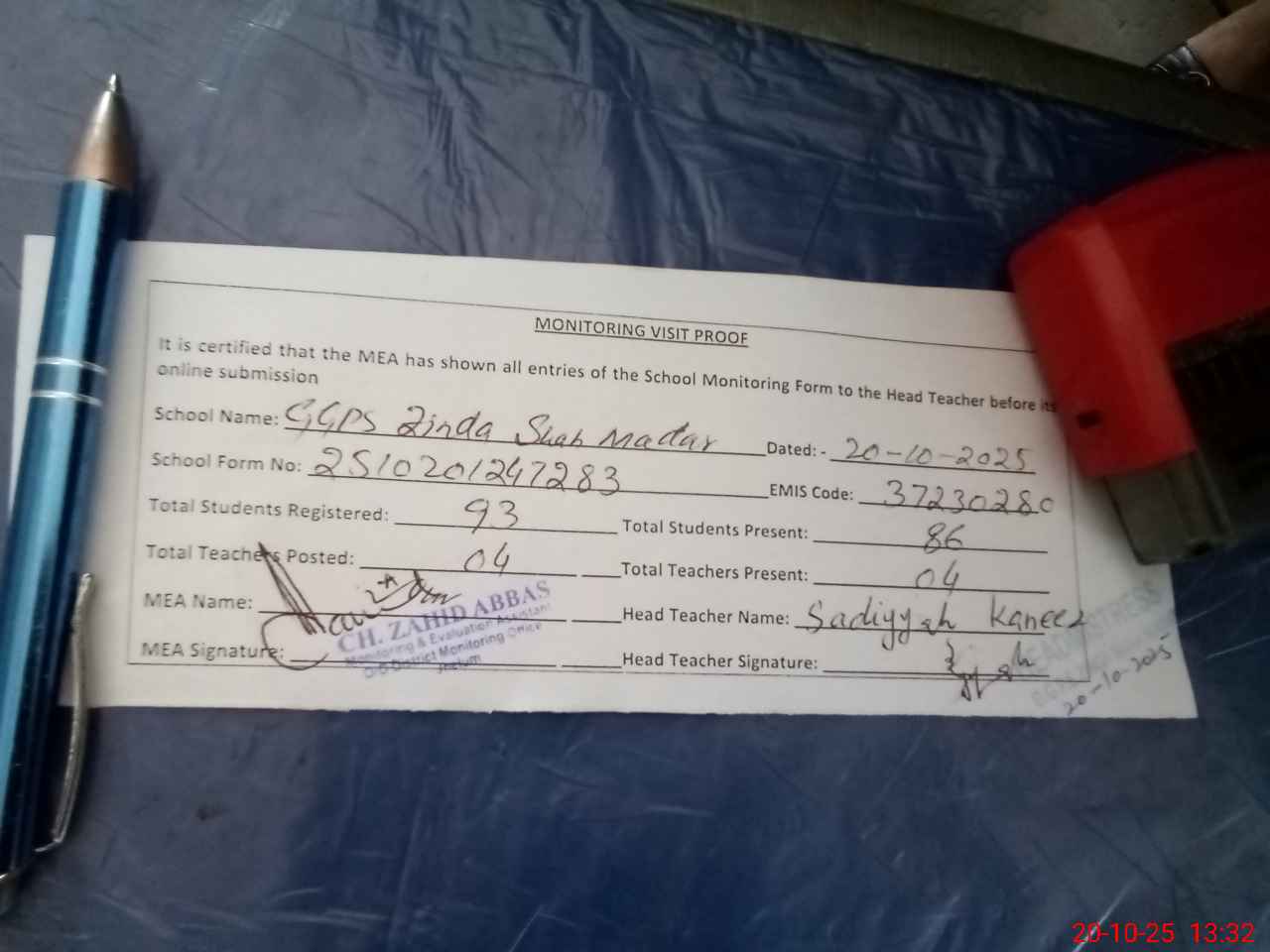 | Monitoring Date: 20-10-2025 | Start Time: 20-10-2025 12:47 PM | End Time: 20-10-2025 01:39 PM | Name of MEA: Za**** Ab**** | |