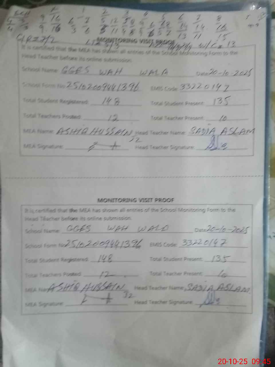 | Attendance Register | Head Teacher | MEA with School | Visit Proof |