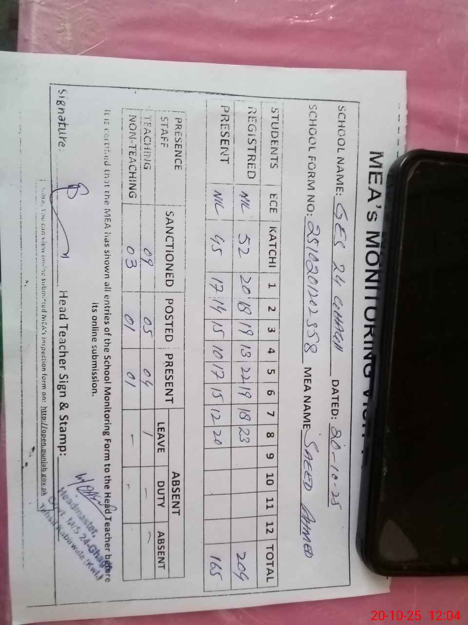 | Attendance Register | Head Teacher | MEA with School | Visit Proof |