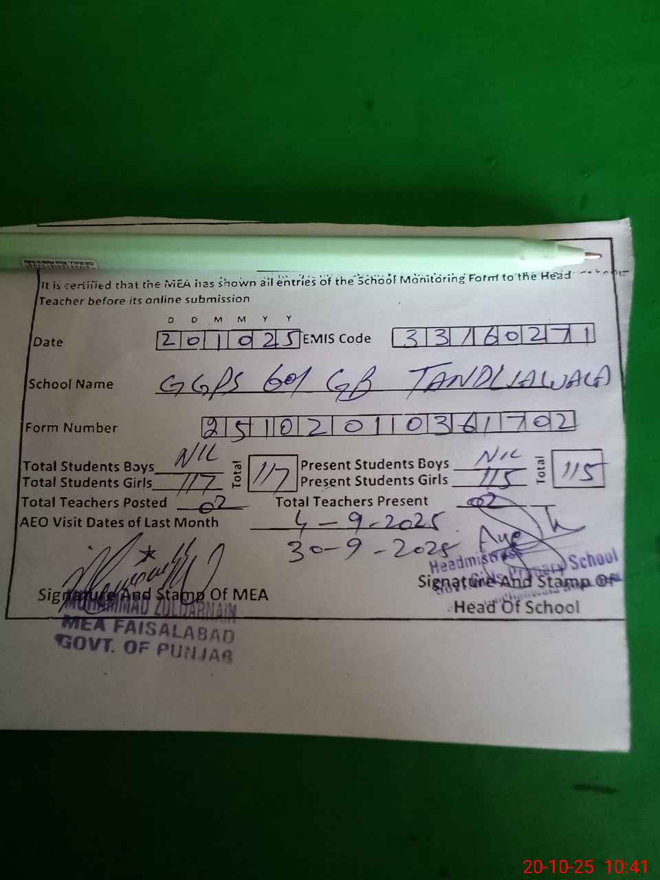 | Certified that this School was Inspected by the Undersigned MEA/DMO Today and the Information Stated Above is as Per Record. | |||||