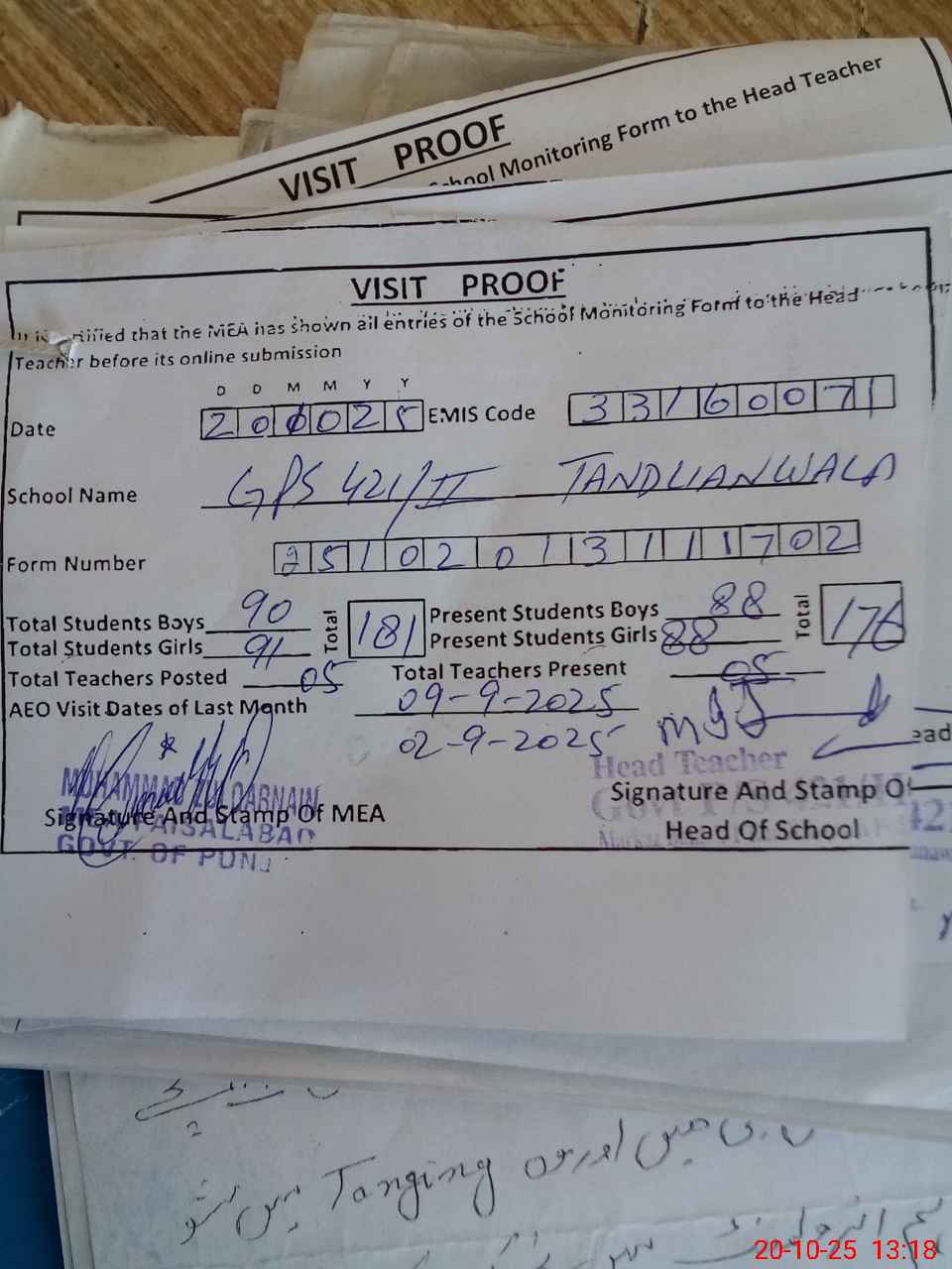 | Attendance Register | Head Teacher | MEA with School | Visit Proof |