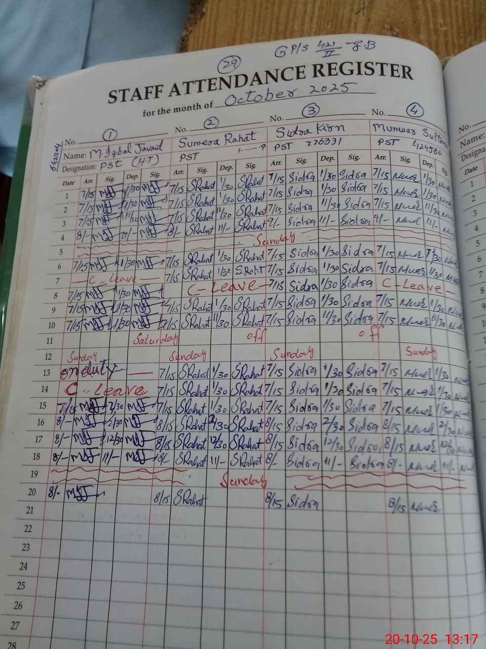 | CNIC | Full Name | Designation | R/C | Absence During Last Calender Month |