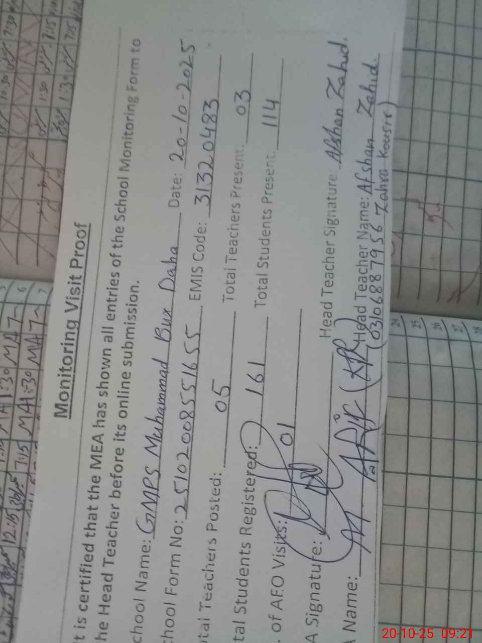 | Attendance Register | Head Teacher | MEA with School | Visit Proof |