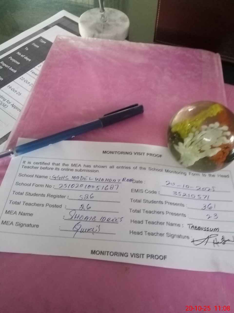 | Attendance Register | Head Teacher | MEA with School | Visit Proof |