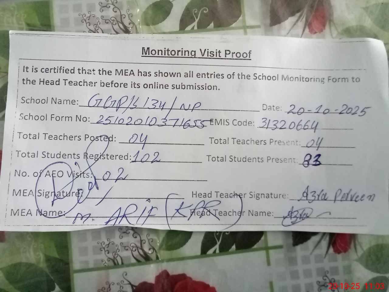 | Attendance Register | Head Teacher | MEA with School | Visit Proof |