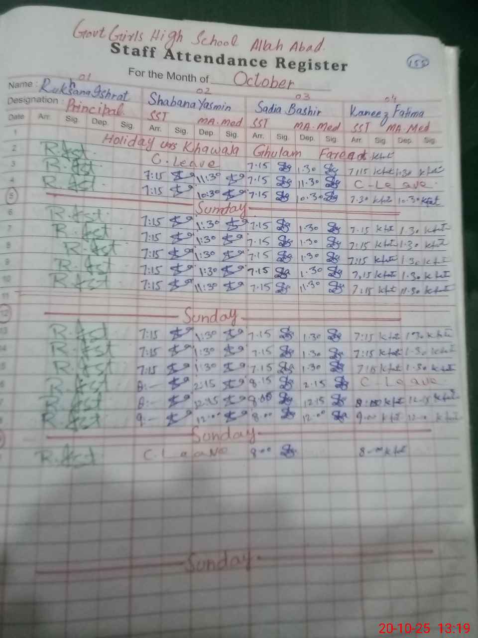 | Remarks (Use Separate Page if Required): Low attendence of students 08 class rooms are dangerous | |||||