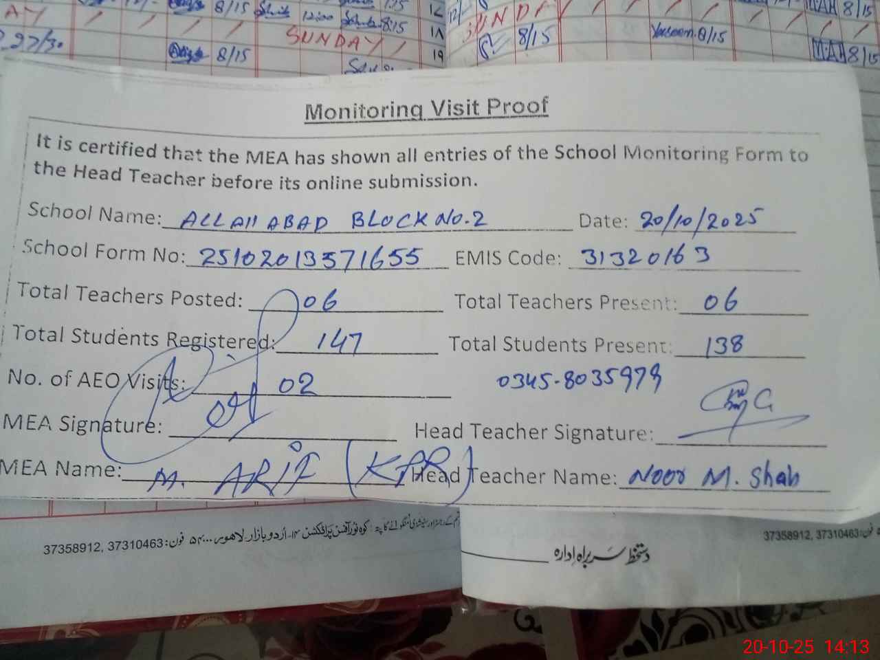 | EMIS Code: 31320163 | Name of School: GPS ALLAH ABAD BLOCK NO 2 | |||