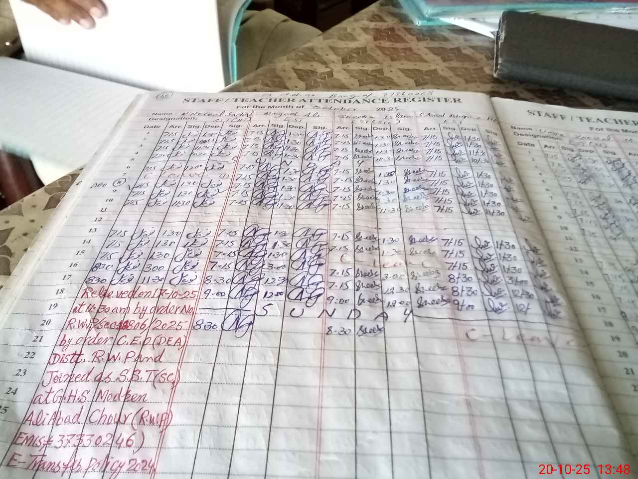 | CNIC | Full Name | Designation | R/C | Absence During Last Calender Month |