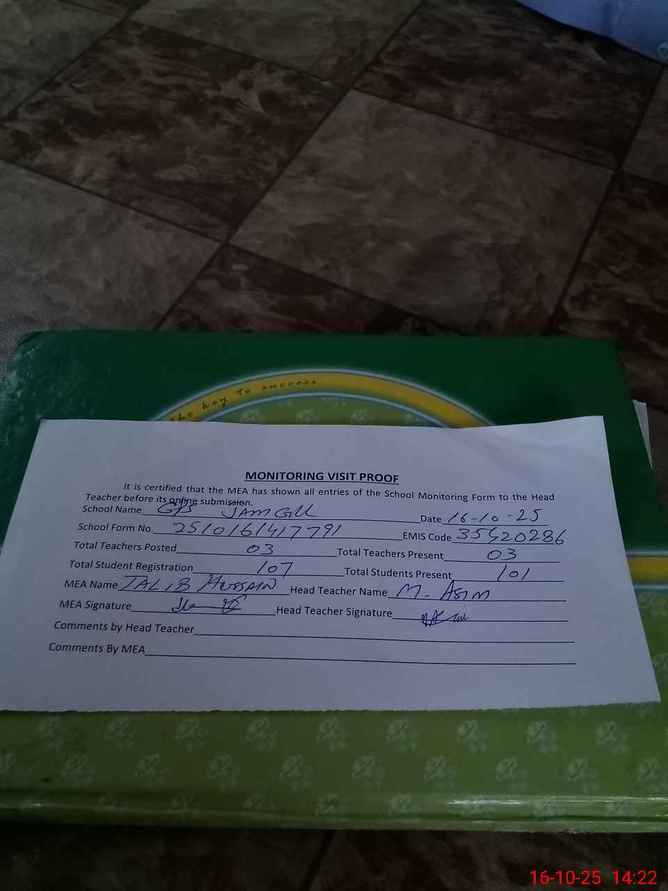 | Attendance Register | Head Teacher | MEA with School | Visit Proof |