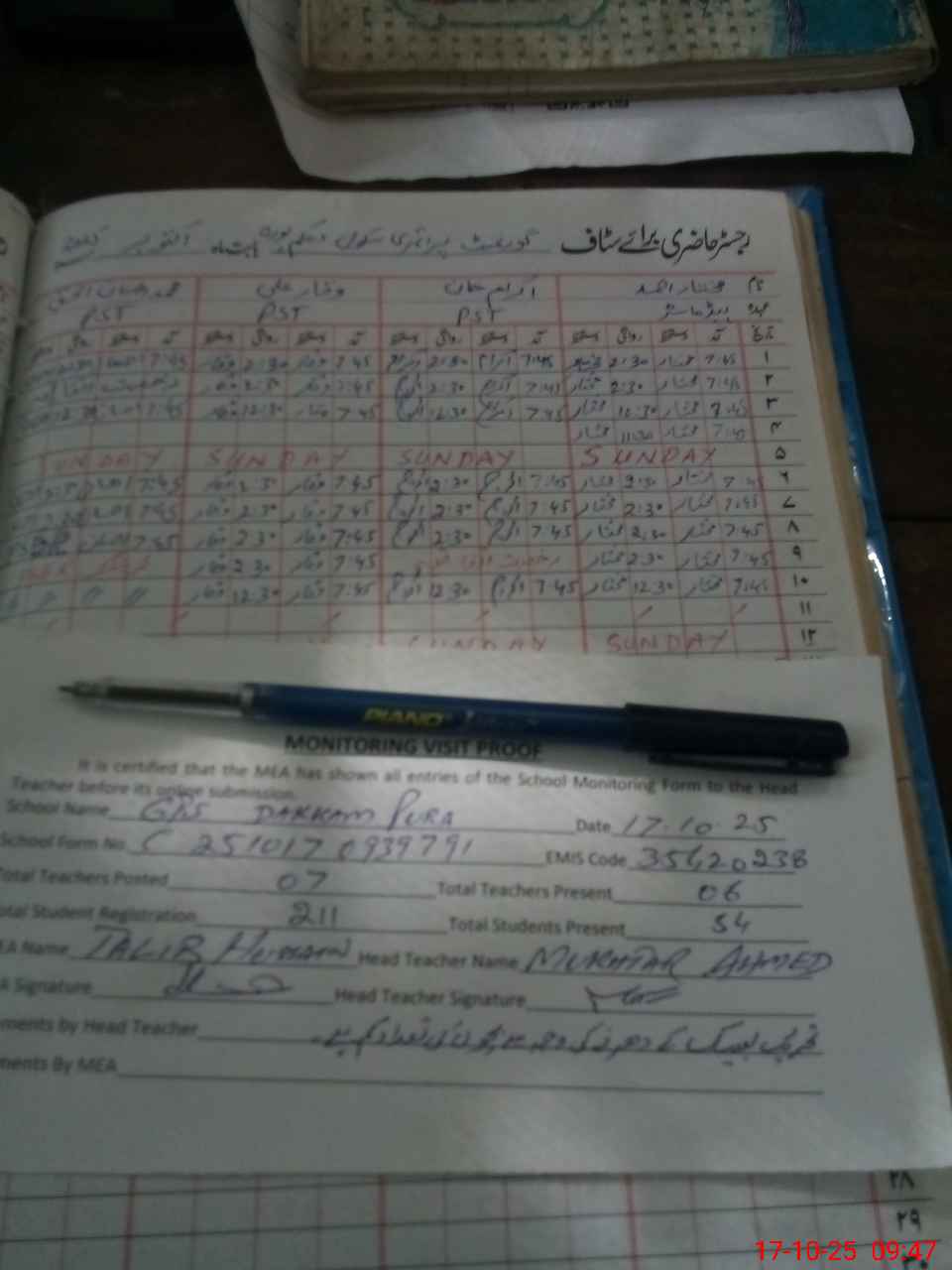 | Attendance Register | Head Teacher | MEA with School | Visit Proof |