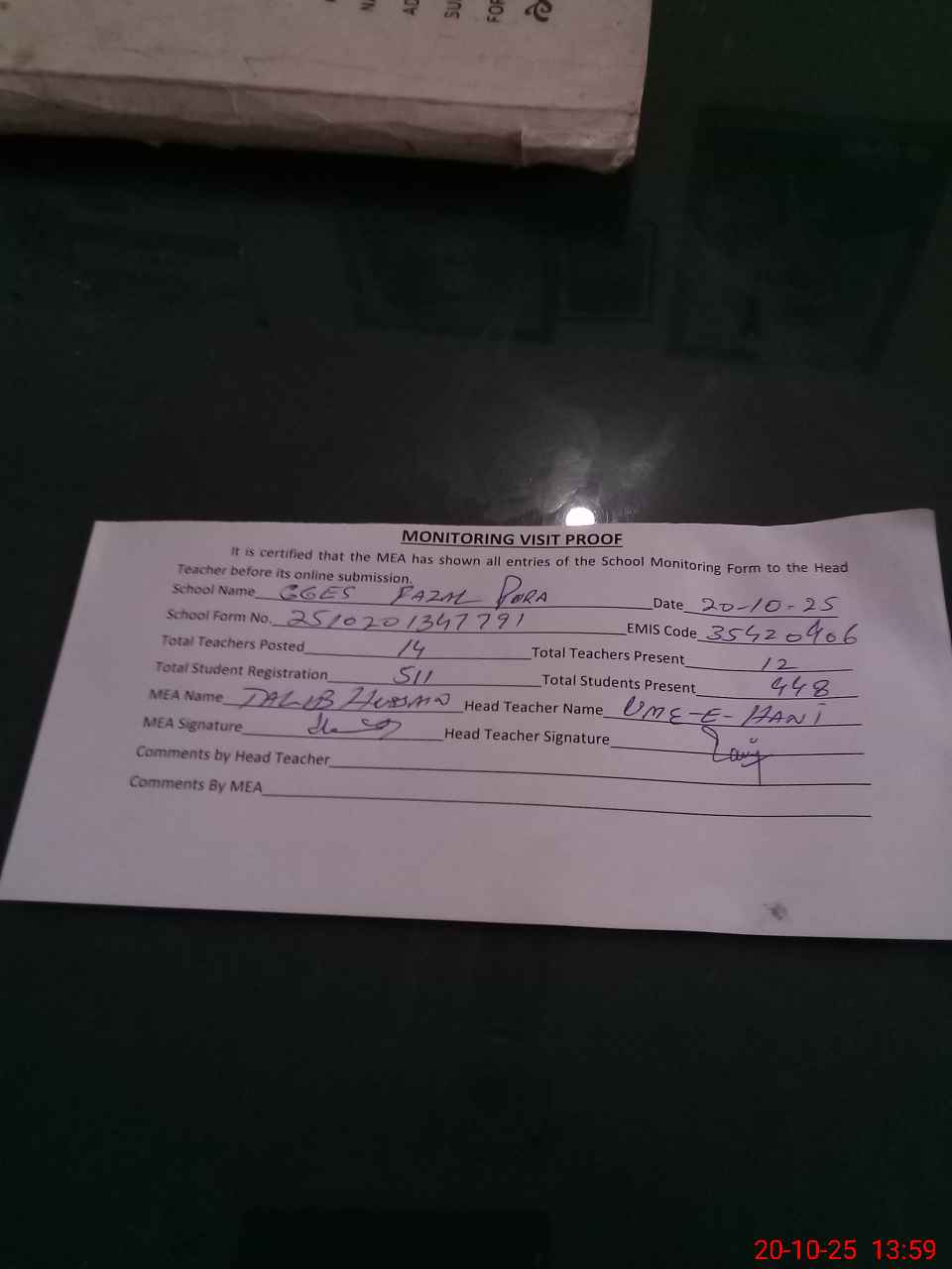 | Attendance Register | Head Teacher | MEA with School | Visit Proof |