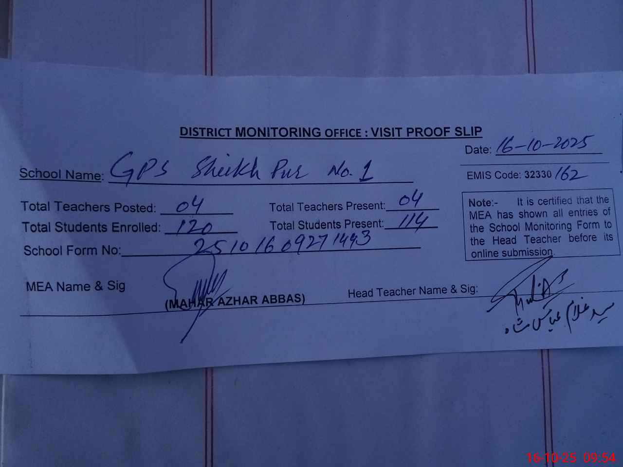| EMIS Code: 32330162 | Name of School: GPS SHEIKH PUR NO. 1 | |||