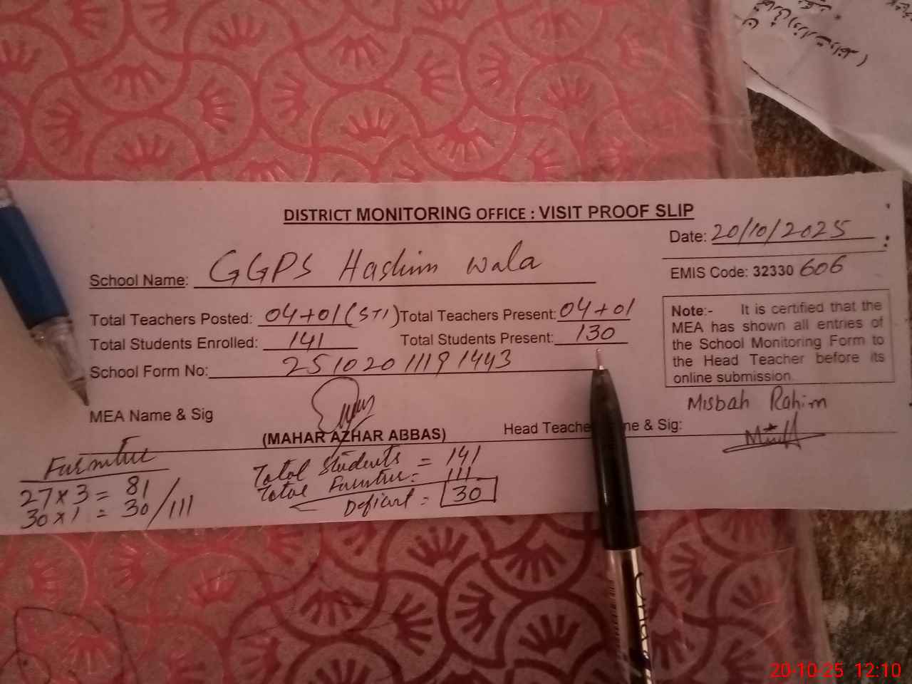 | EMIS Code: 32330606 | Name of School: GGPS HASHIM WALA | |||