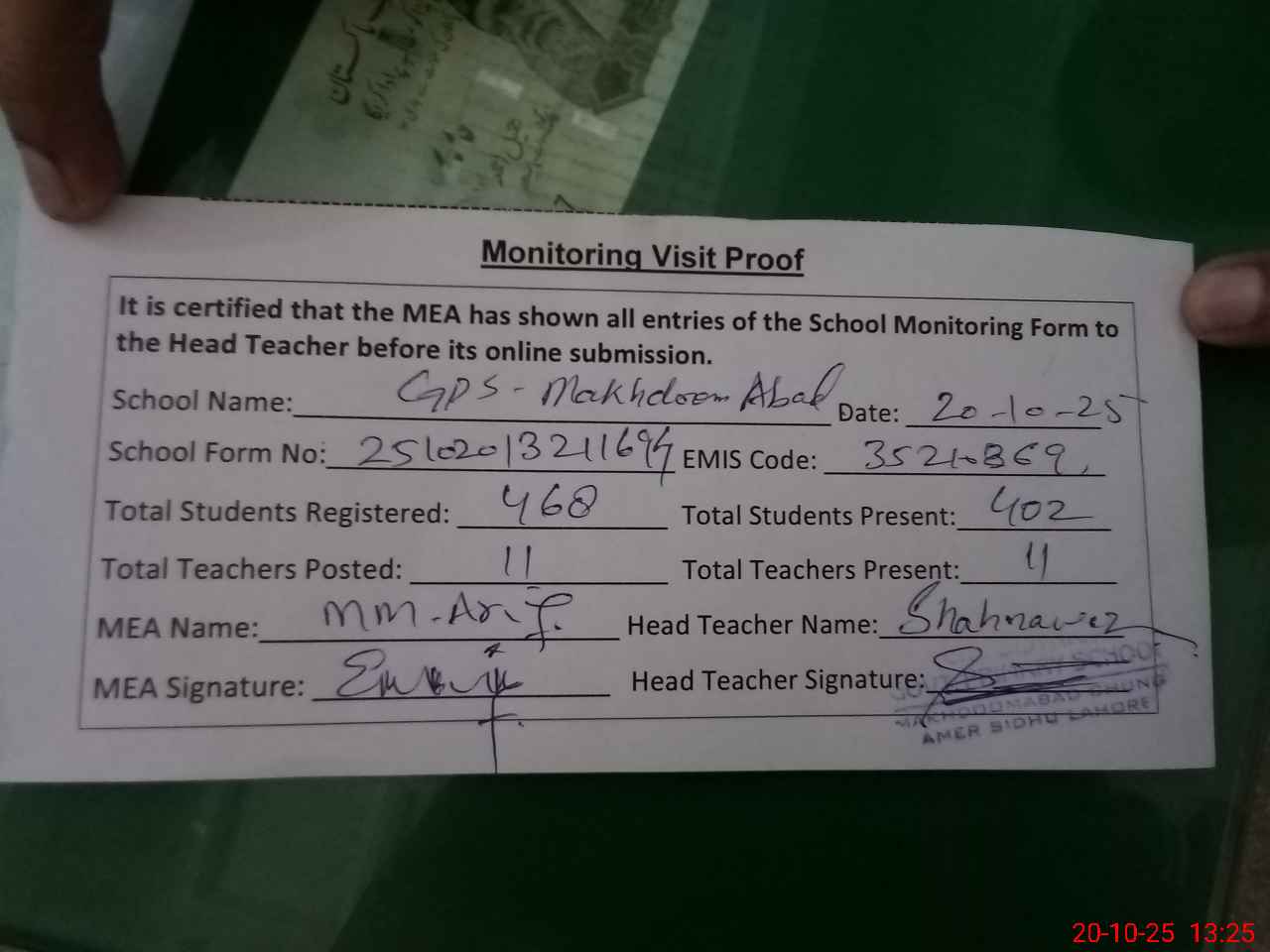 | Attendance Register | Head Teacher | MEA with School | Visit Proof |