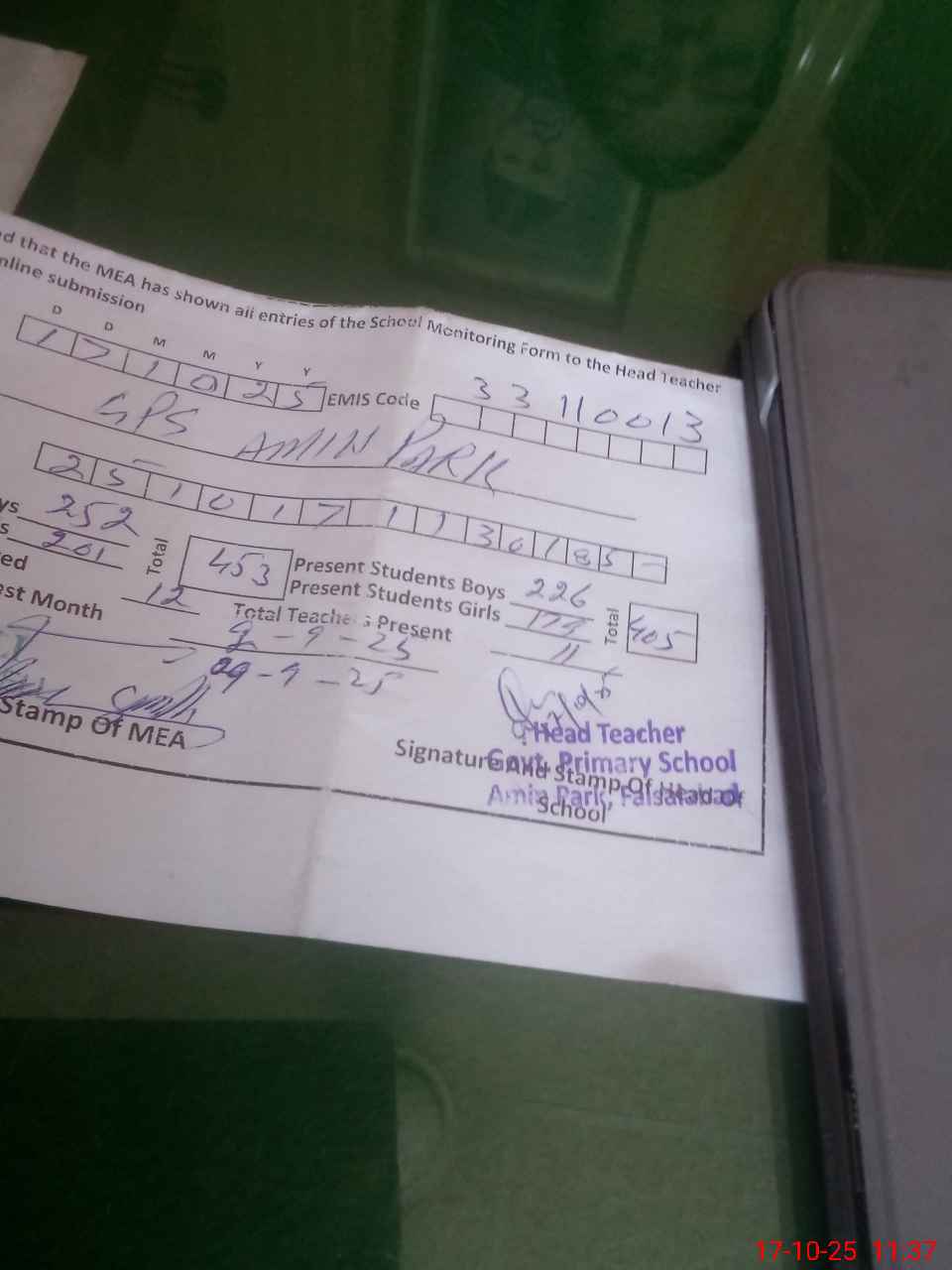 | EMIS Code: 33110013 | Name of School: GPS AMIN PARK FSD | |||