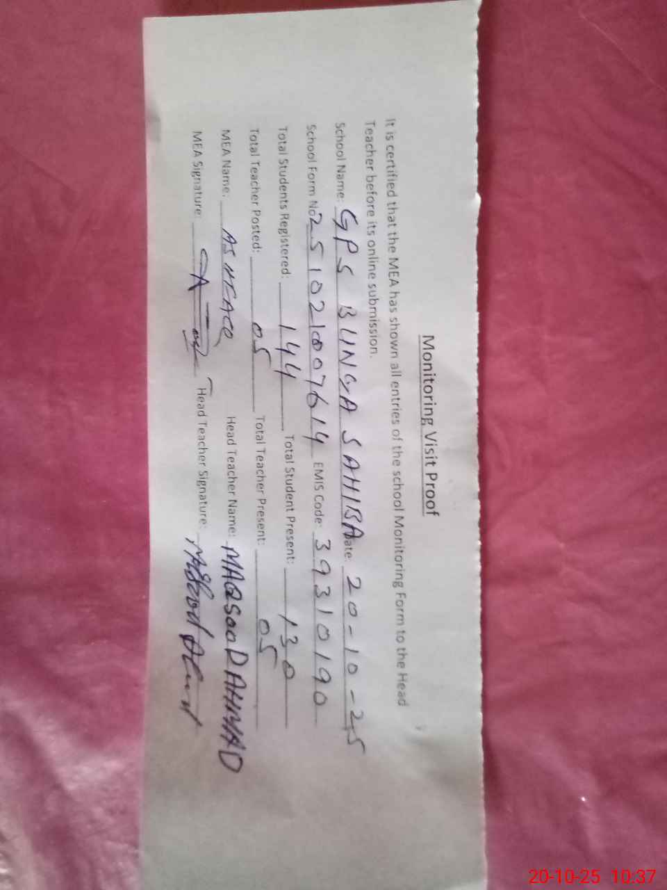 | Attendance Register | Head Teacher | MEA with School | Visit Proof |