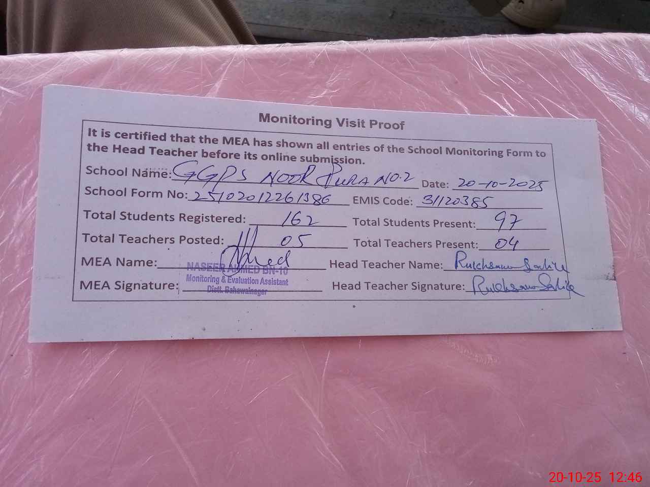 | Attendance Register | Head Teacher | MEA with School | Visit Proof |