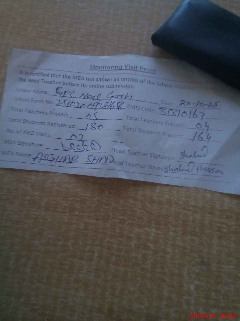 | Attendance Register | Head Teacher | MEA with School | Visit Proof |