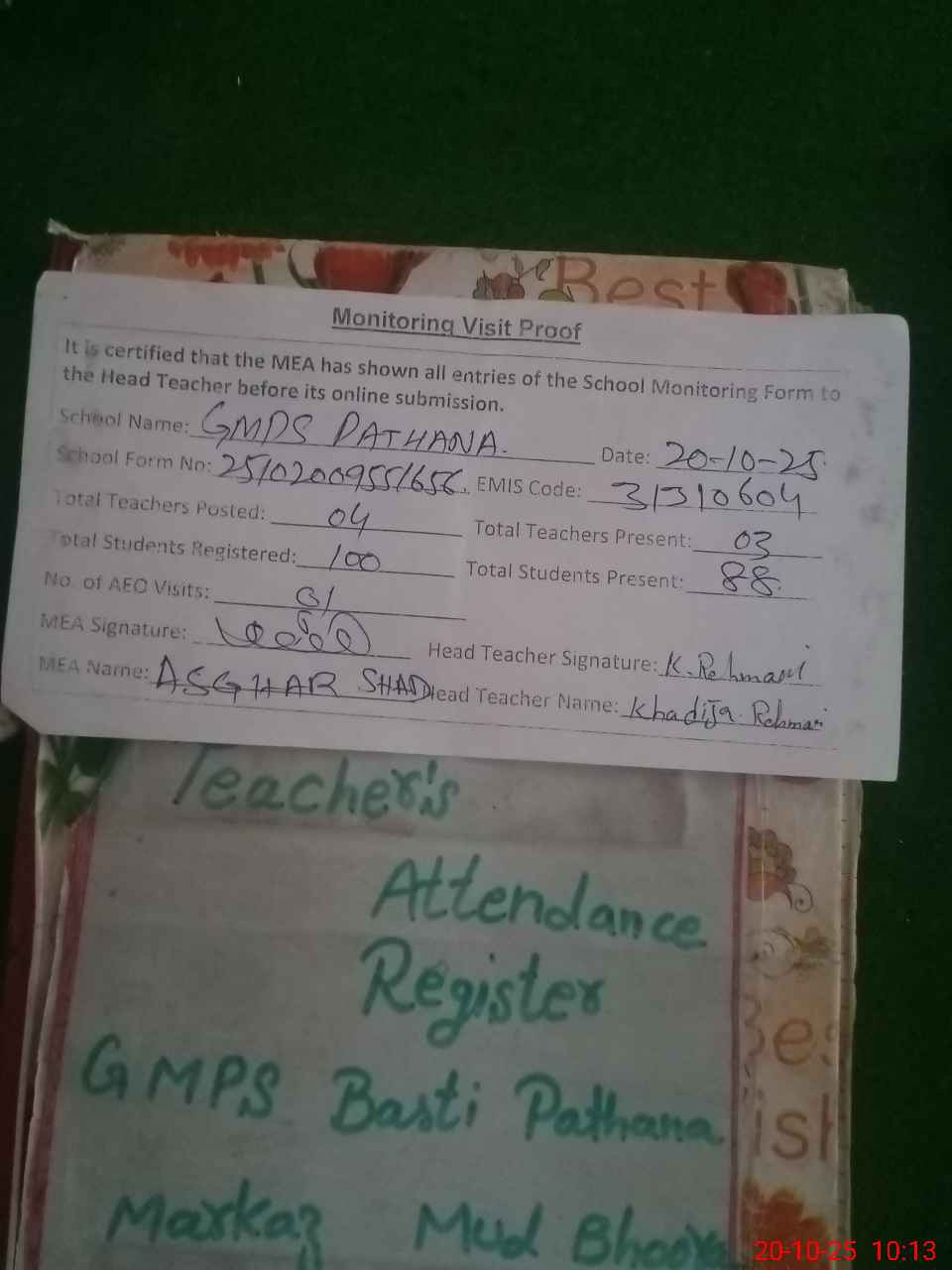 | Attendance Register | Head Teacher | MEA with School | Visit Proof |