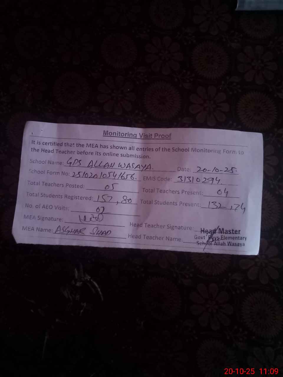 | EMIS Code: 31310294 | Name of School: GPS ALLAH WASAYA (After Noon) | |||
