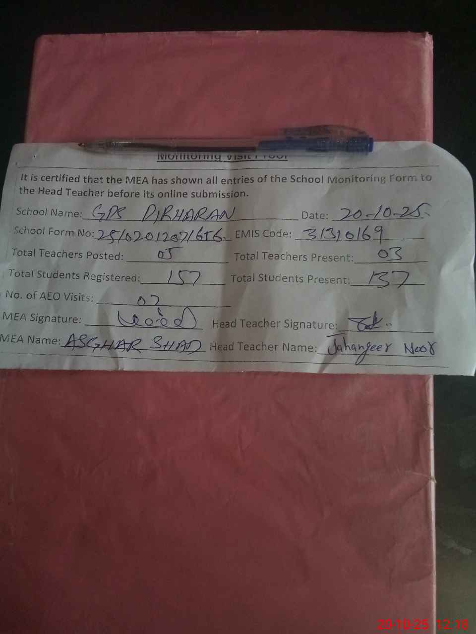 | Attendance Register | Head Teacher | MEA with School | Visit Proof |