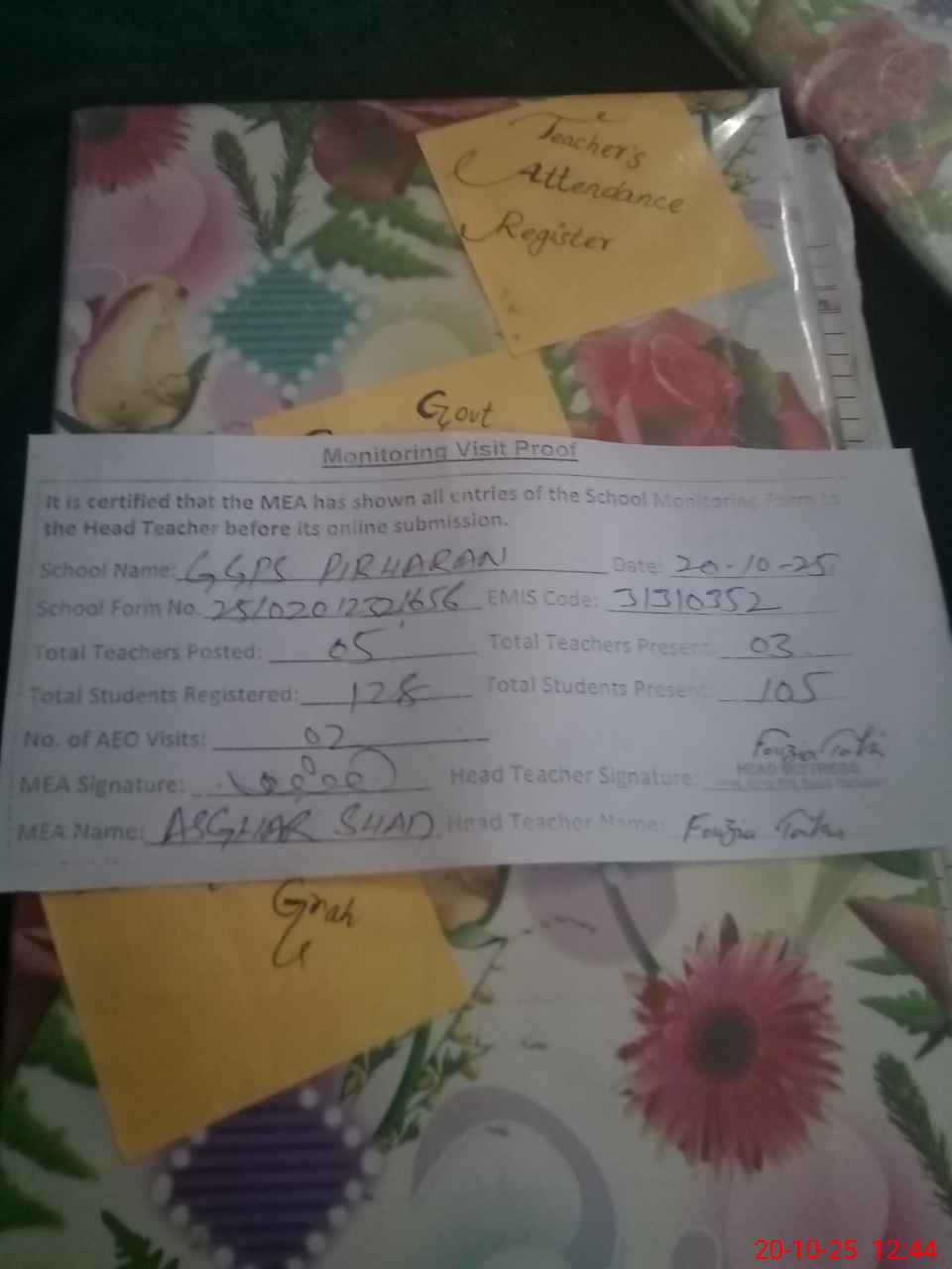 | Attendance Register | Head Teacher | MEA with School | Visit Proof |