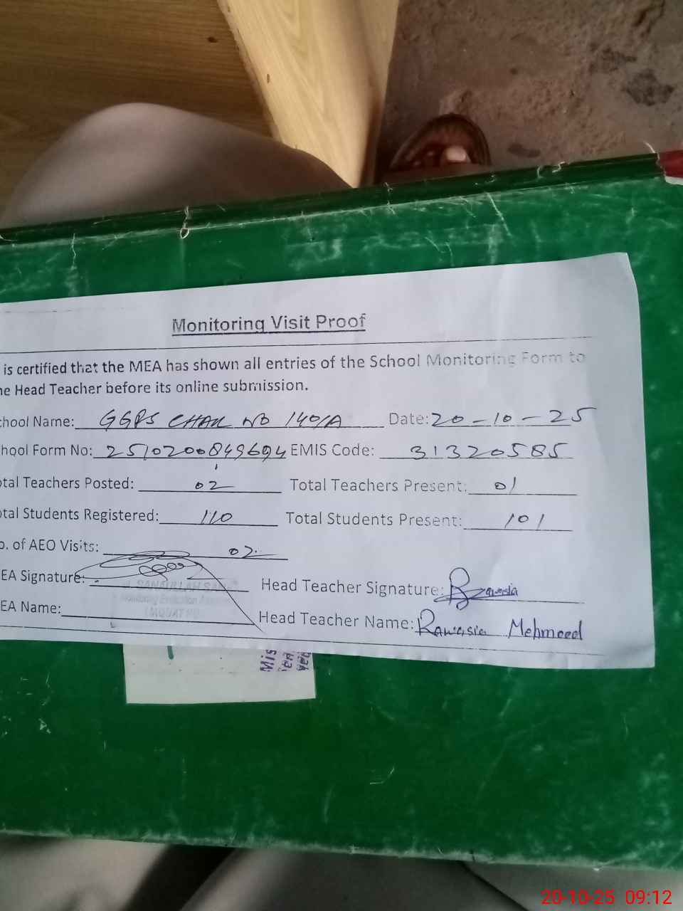 | Attendance Register | Head Teacher | MEA with School | Visit Proof |