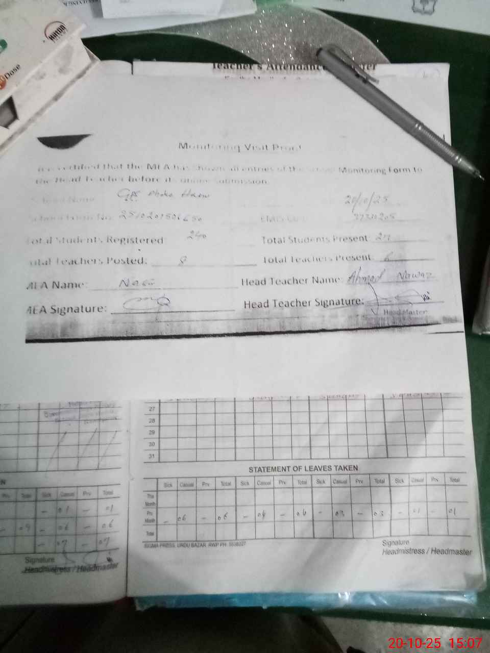 | Attendance Register | Head Teacher | MEA with School | Visit Proof |