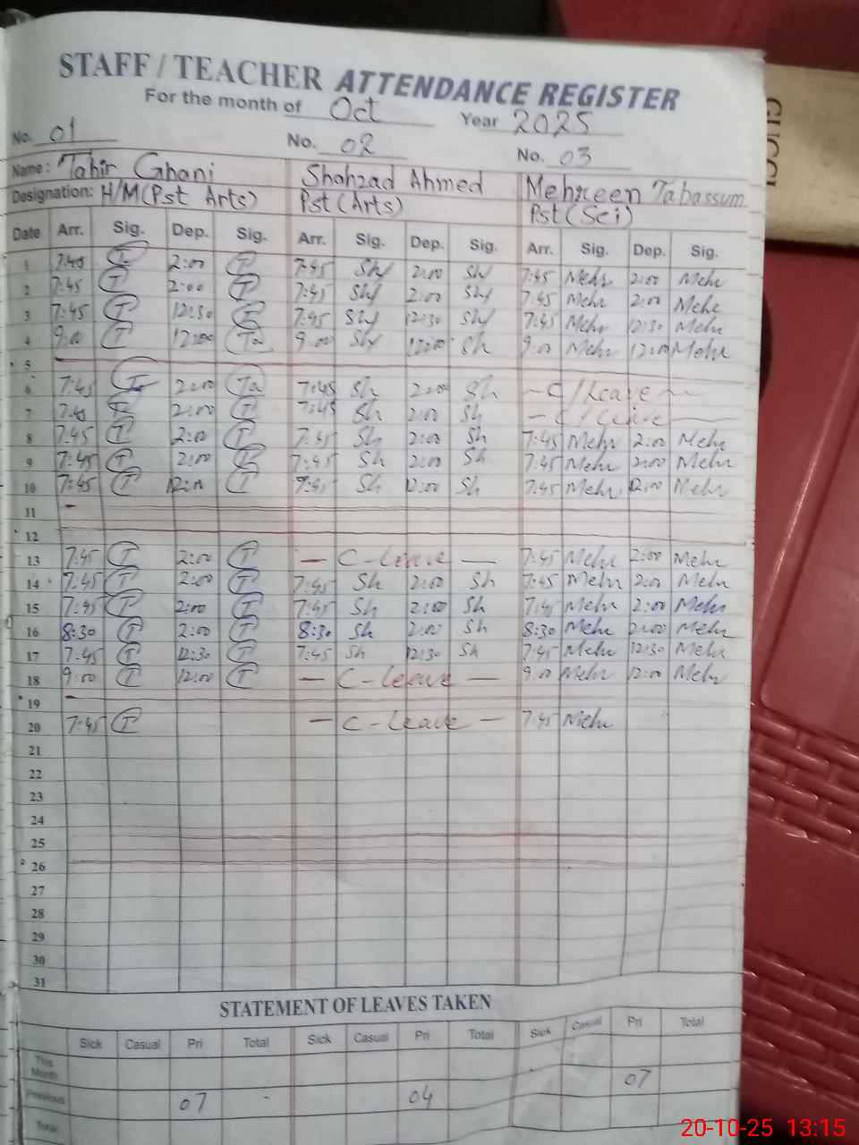 | CNIC | Full Name | Designation | R/C | Absence During Last Calender Month |