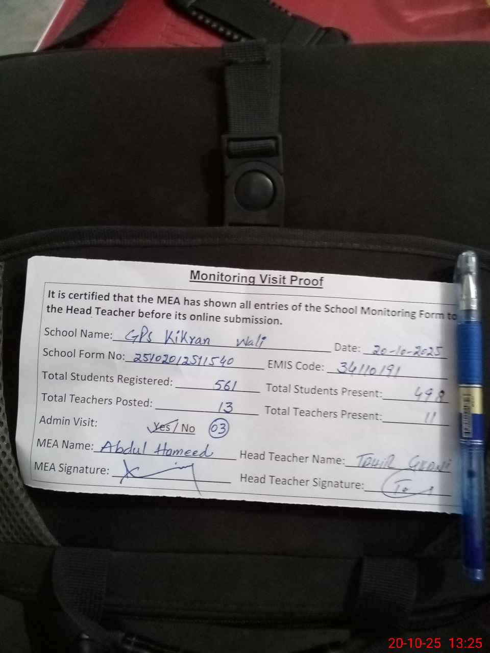 | Attendance Register | Head Teacher | MEA with School | Visit Proof |
