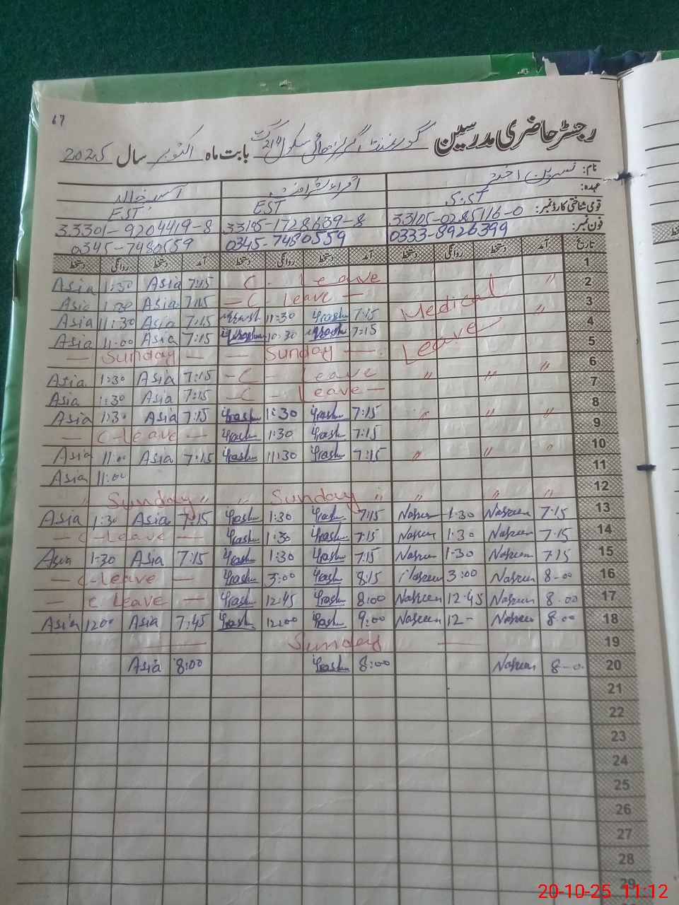 | CNIC | Full Name | Designation | R/C | Absence During Last Calender Month |