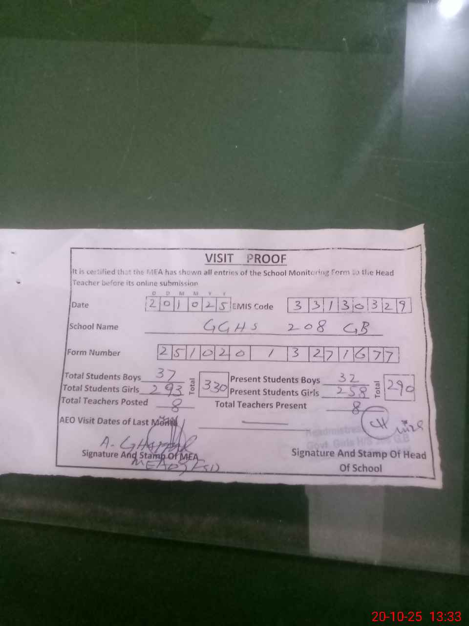 | EMIS Code: 33130329 | Name of School: GGHS CHAK NO.208/GB | |||
