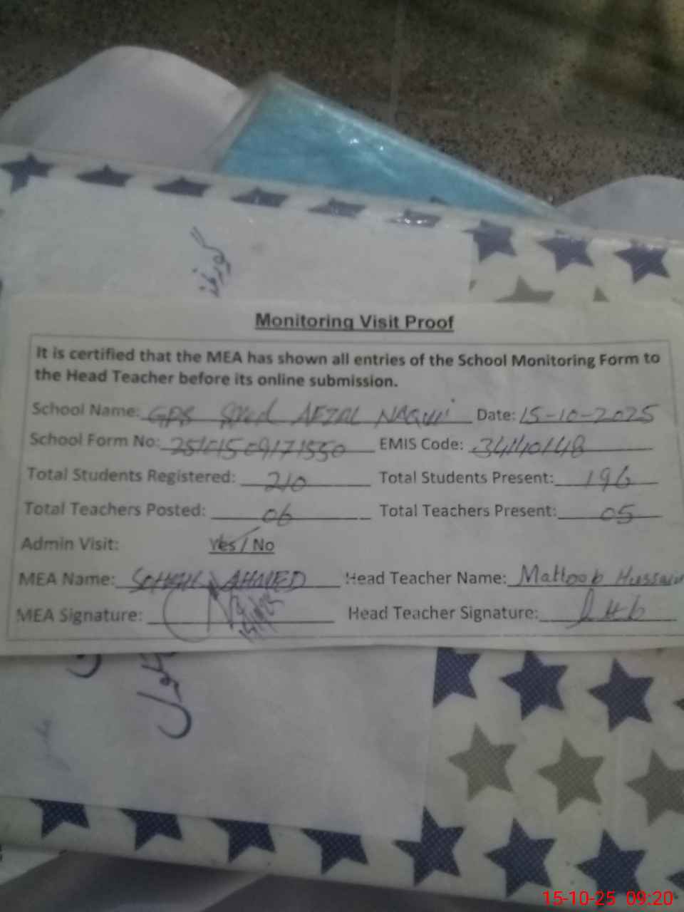 | Monitoring Date: 15-10-2025 | Start Time: 15-10-2025 08:43 AM | End Time: 15-10-2025 09:28 AM | Name of MEA: N-**** Ah**** | |