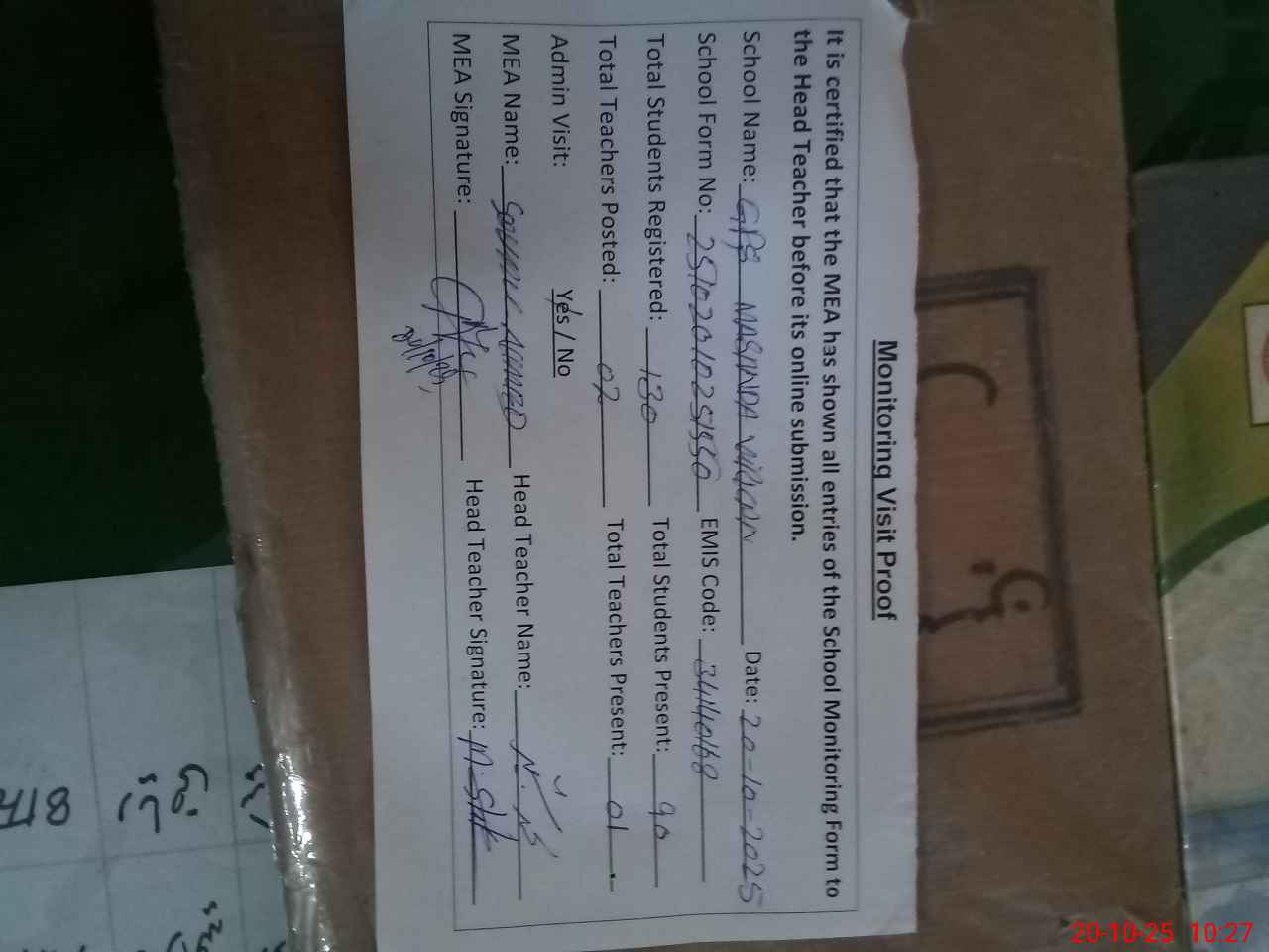 | Attendance Register | Head Teacher | MEA with School | Visit Proof |