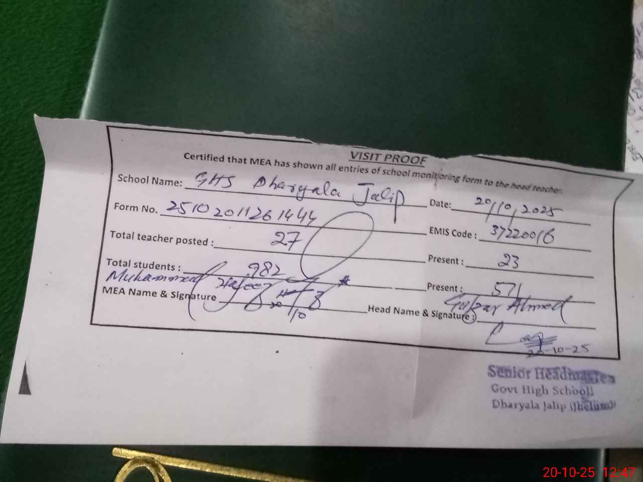 | Remarks (Use Separate Page if Required): Sir EST teacher Arshad was not present in school he applied leave but from Headmaster Gulzar Ahmed not approved till 1203 hrs 20 October 2025 EST Atiq ur Rehman Applied but not approved from Headmaster till 1204 hrs 20 October 2025 EST Tariq applied but not approved from Headmaster till 1205 hrs During visit I observed and seen students are working in school White wash and jharo working School students attendance on students attendance register is totally fake not actual attendance according head count I requested again and again to Headmaster for biometric teacher attendance print not provide from Headmaster During many visit I observed Headmaster not perform his duty according his responsibility and administration control Given fake figure of students attendance on roznamacha and according head count figure totally difference Please check and instruct him strictly action against him | |||||