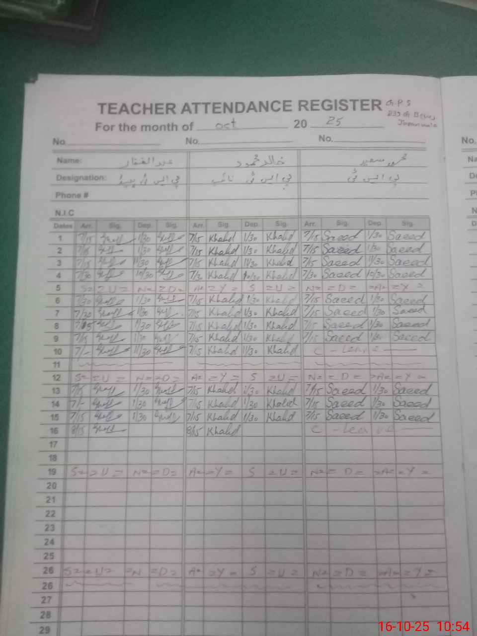 | CNIC | Full Name | Designation | R/C | Absence during last cal. month |