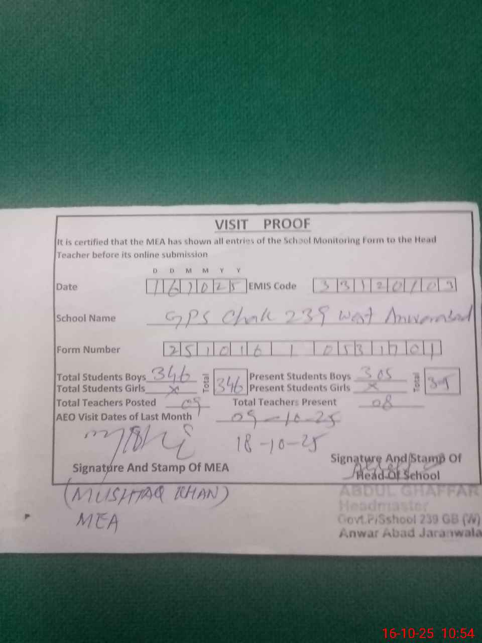 | Attendance Register | Head Teacher | MEA with School | Visit Proof |