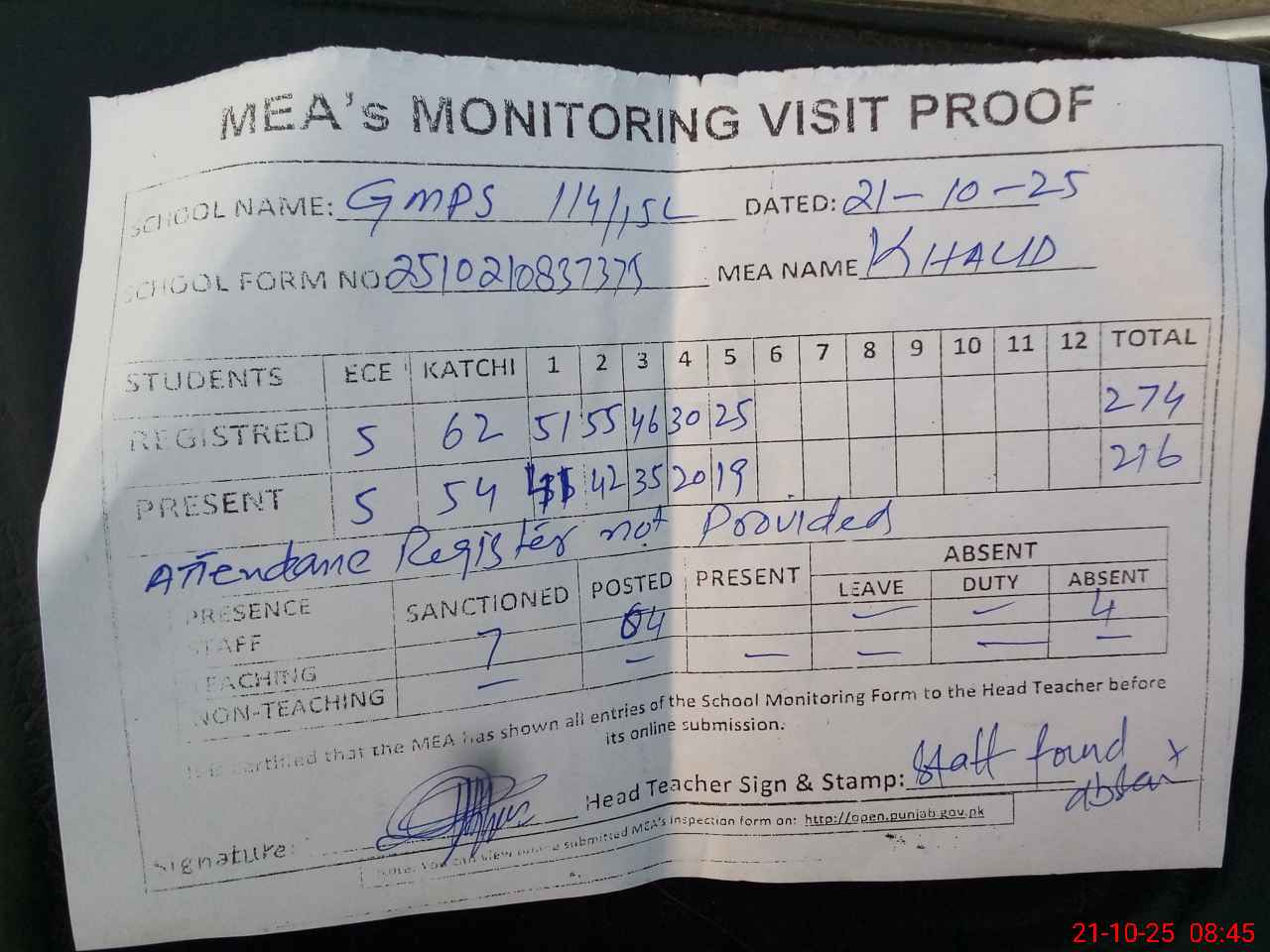 | Attendance Register | Head Teacher | MEA with School | Visit Proof |